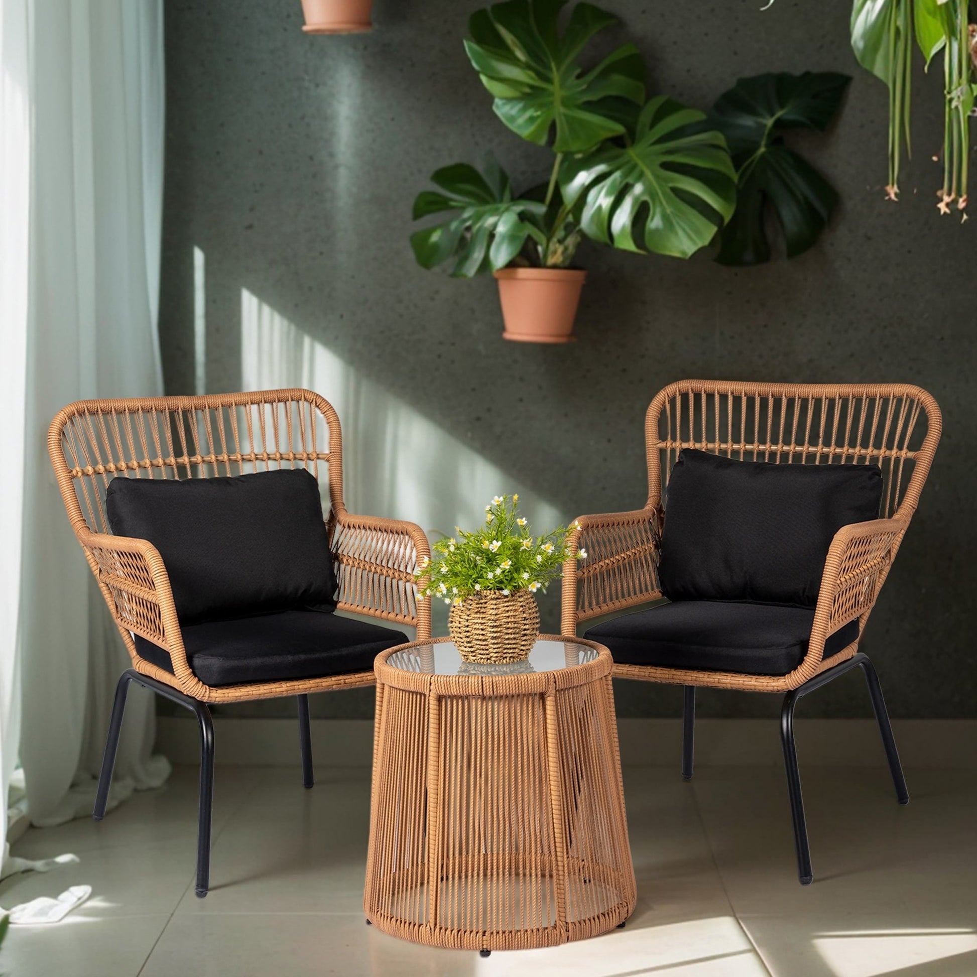 - Ensemble de bistrot de conversation en osier d'extérieur 3 pièces, meubles de patio en rotin toutes saisons avec chaises et table pour balcon, porche de jardin et arrière-cour,