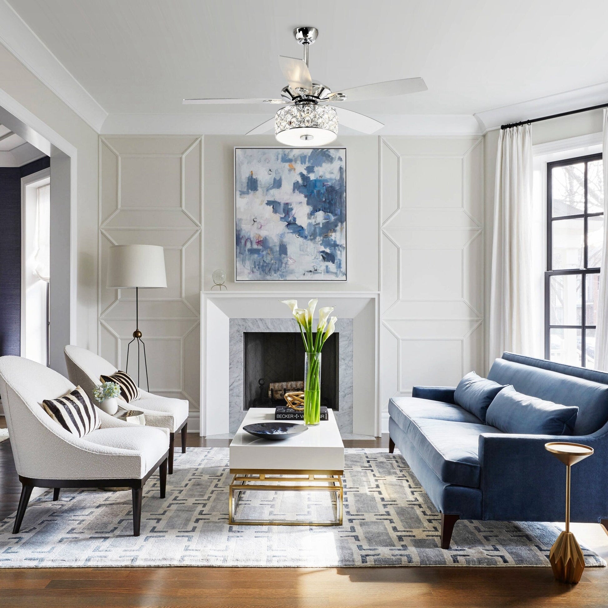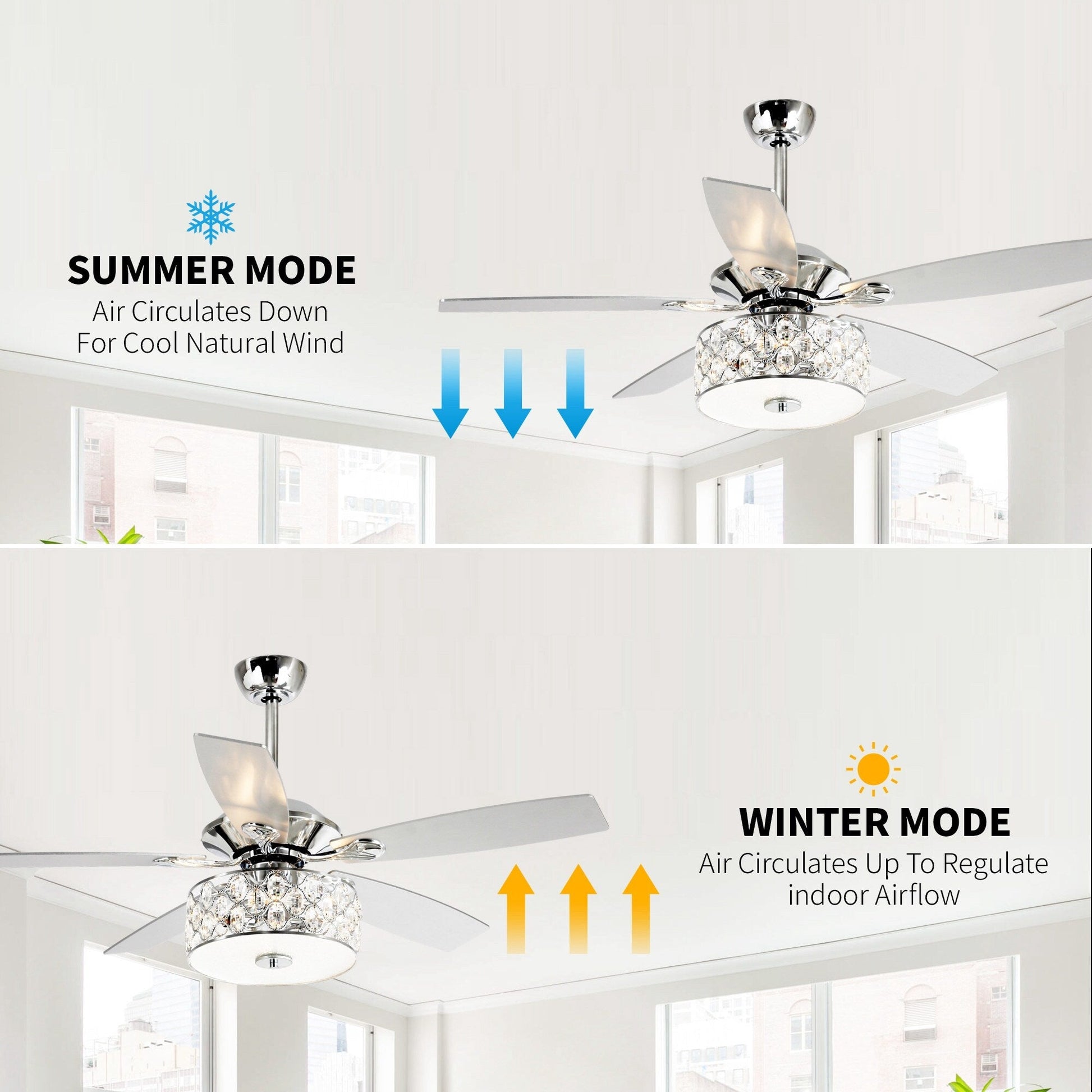 Apportez une touche de sophistication moderne à votre espace de vie avec ce ventilateur de plafond moderne de 13,7 m (52 pi) à 4 lumières en cristal avec télécommande. Son cadre en métal chromé et ses pales en bois teinté argent lui confèrent un style élégant et moderne, idéal pour toutes les pièces de votre maison. Profitez des avantages d'un moteur réversible à trois vitesses, utilisable en hiver pour économiser de l'énergie. Une télécommande permet d'allumer et d'éteindre facilement la lumière et de régler la vitesse du ventilateur à votre convenance.