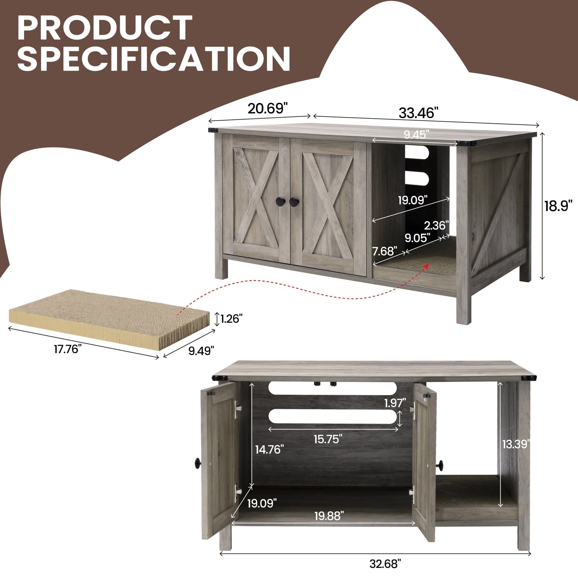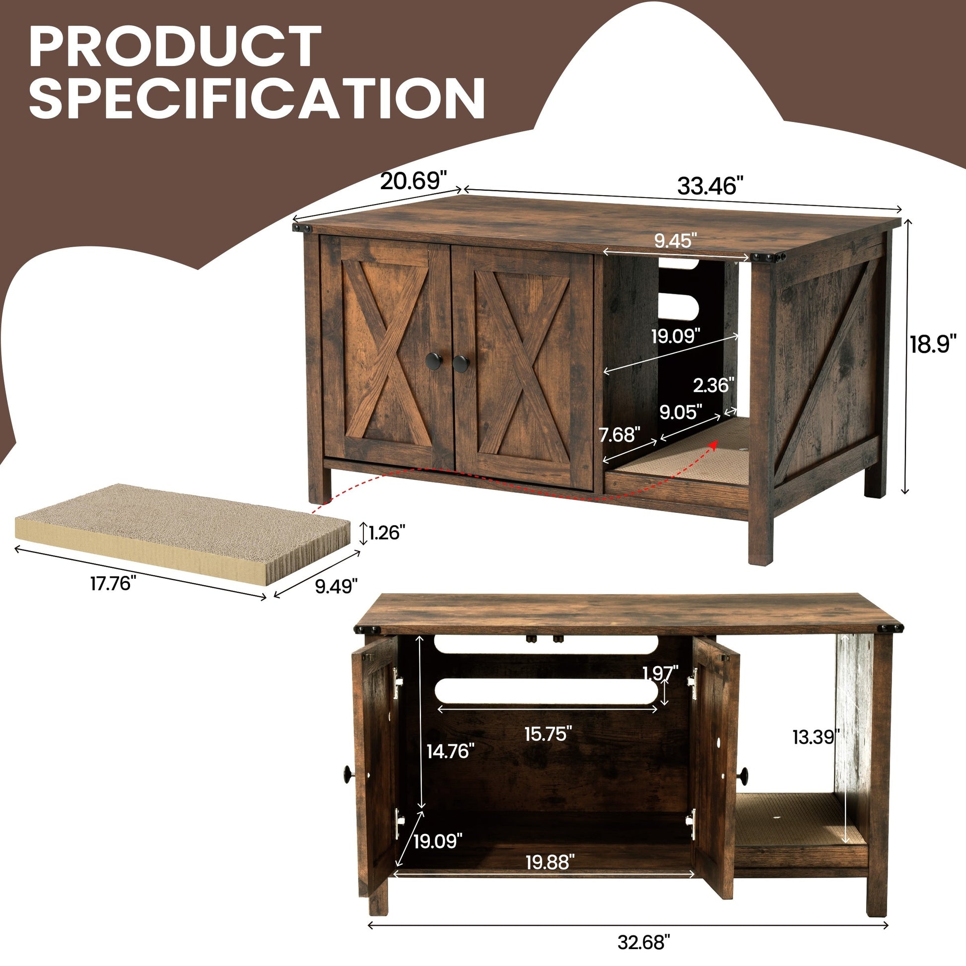 Don’t you think it’s time your cat went to bathroom in style?! We do and that’s why we created this beautiful and modern looking cat litter box! A smart and attractive way to keep the litter hidden away. This well-designed multi-functional litter box enclosure can be used as a side table, as well as a pet house or litter box enclosure. The double door design and open channel not only allows your cat to enter and exit freely, allowing the cute cat to have a warm little home, but also has a good ventilation effect and allows light to filter through without leaving our cute cat completely in the dark. There is a replaceable scratching pad placed in that open channel, that area is sized to fit most scratching posts.