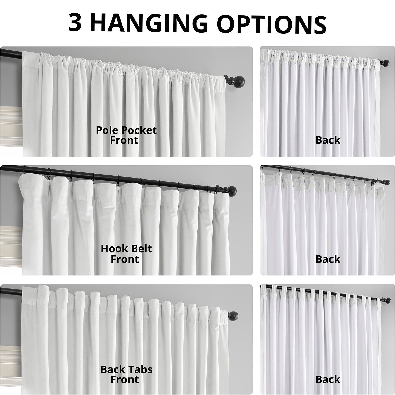 - Versatile Hanging Options: With pole pocket, back tab, and hook belt, they offer flexibility in hanging styles to fit different looks and functionalities.