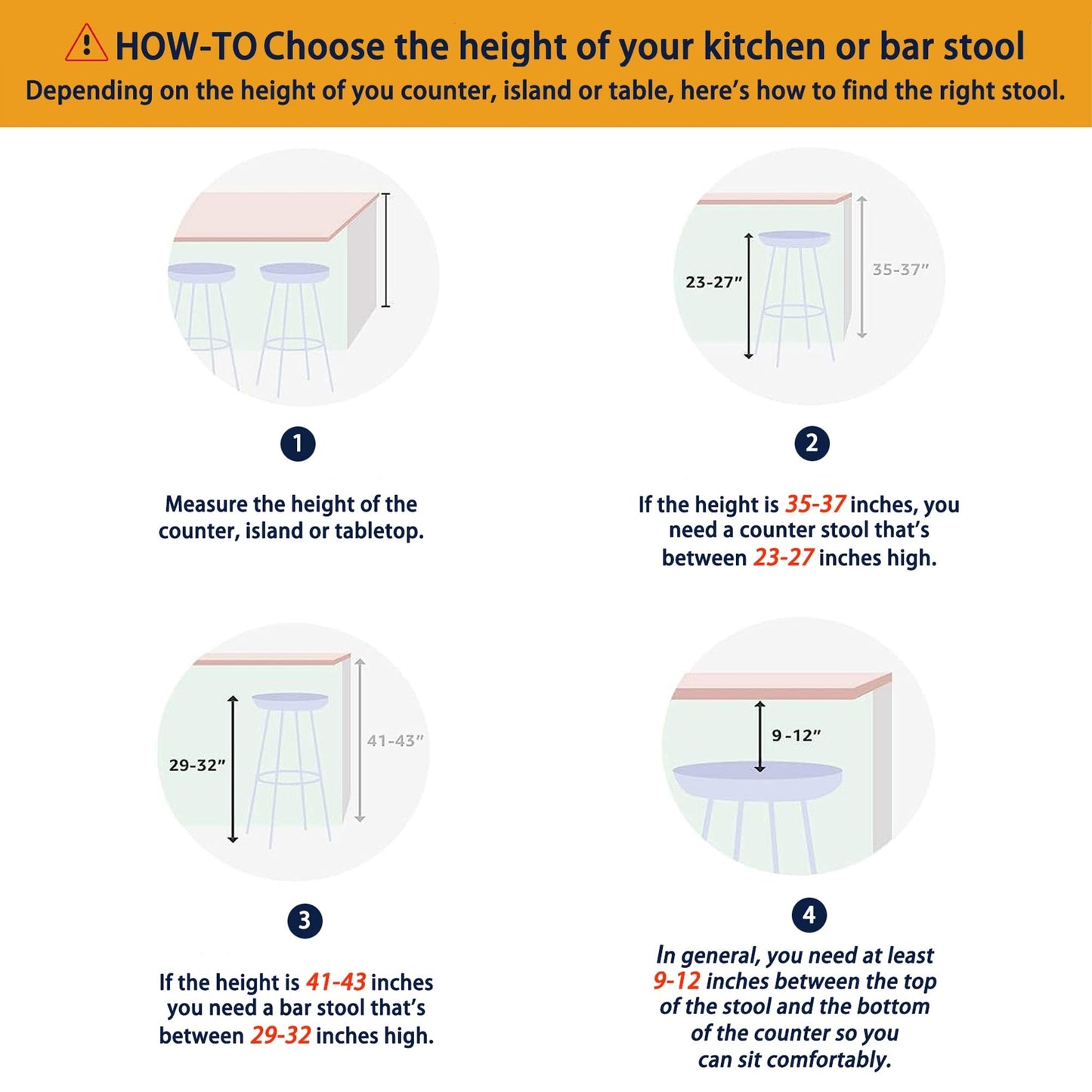 Veuillez d'abord mesurer la hauteur de votre comptoir, îlot ou plateau de table ! Les tabourets de bar conviennent aux comptoirs de 12,5 à 13,0 m de haut et les tabourets de comptoir, aux comptoirs de 10,6 à 11,2 m de haut.