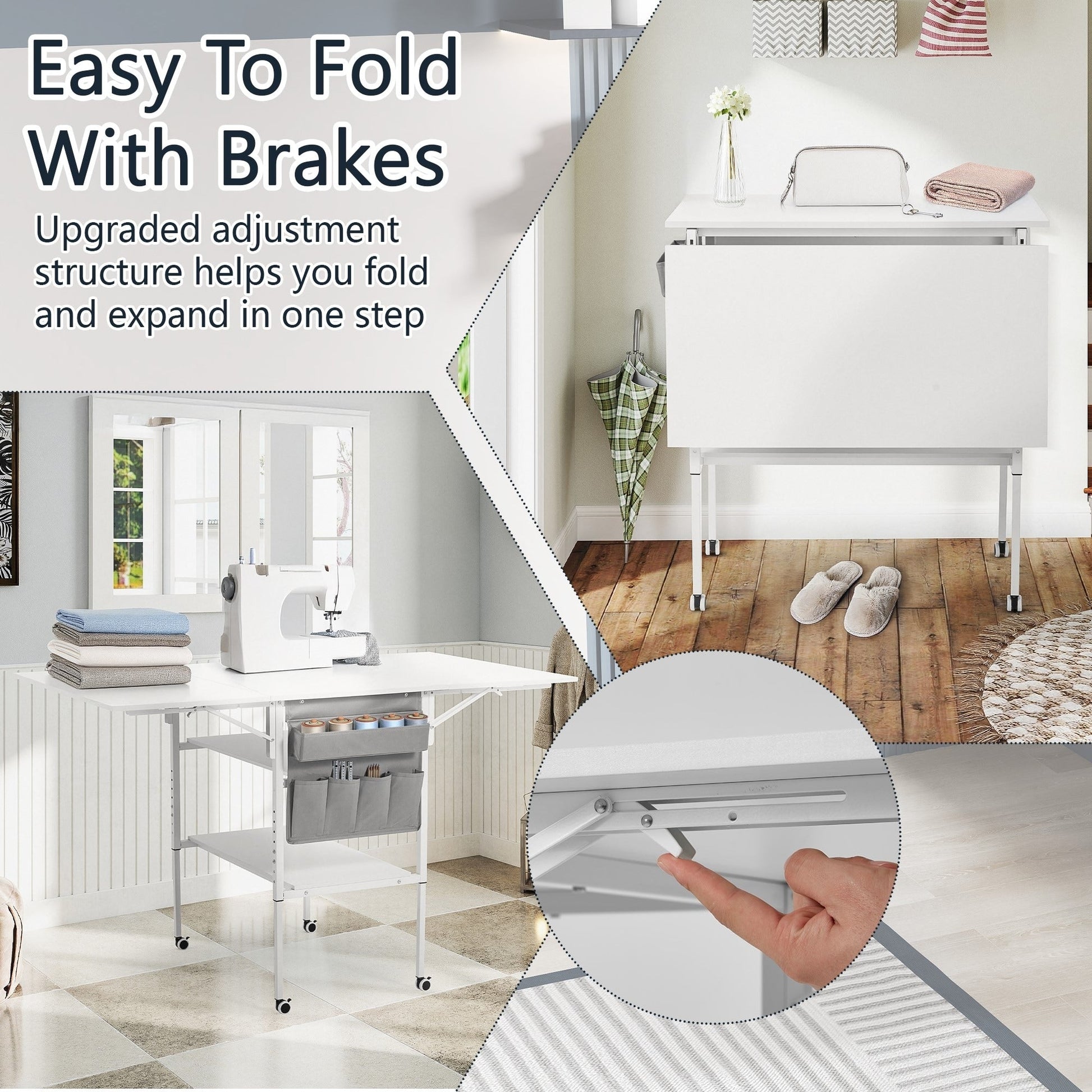 Dotée de deux étagères spacieuses et d'une poche latérale, cette table de bricolage offre un vaste espace de rangement pour les tissus, les fournitures artistiques et le nécessaire de couture. Les étagères permettent d'accéder facilement aux articles fréquemment utilisés, et la hauteur entre les étagères est idéale pour y placer une machine à coudre standard.