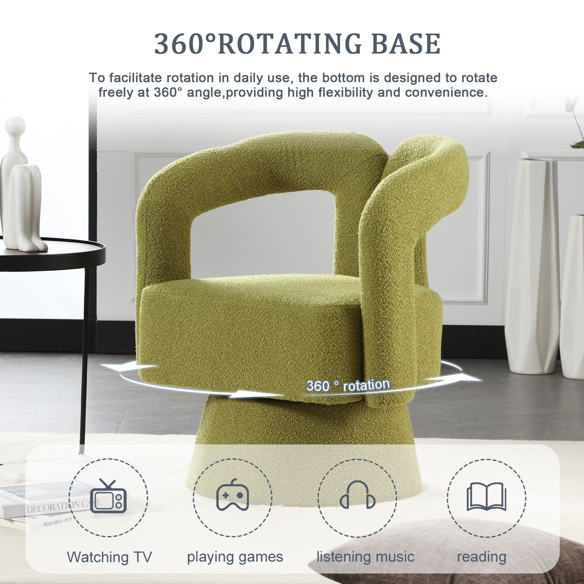 - ?[Enjoy Your Life]Its simple yet elegantly designed round swivel chairs are the perfect combination of luxury and stylish. The accent chair is a unique decor for various occasions which can lift up the aesthetic of the interior design. Also it is a perfect addition to the hotel lounge, bedroom, living room, office, and nursery room.