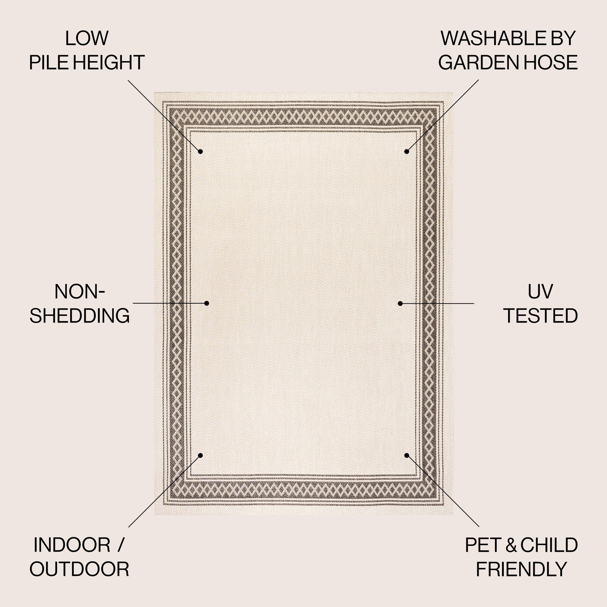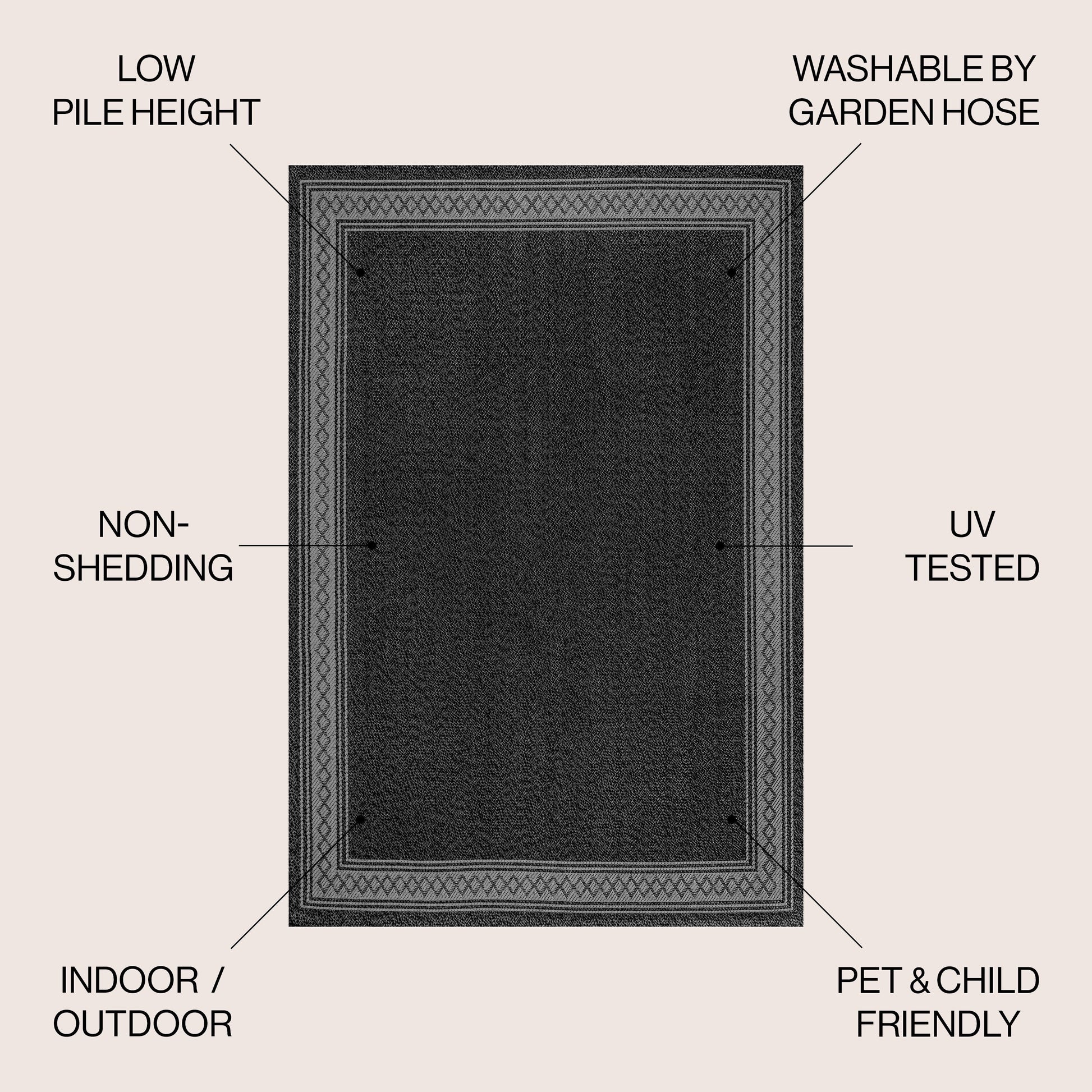 Le classique rencontre le moderne dans notre tapis uni unique à bordure géométrique en losanges. Son motif bicolore est tissé pour créer un tapis d'intérieur et d'extérieur résistant à poils ras. Ce tapis, adapté aux animaux de compagnie, apportera une touche d'originalité à votre salon, salle à manger, chambre ou véranda.