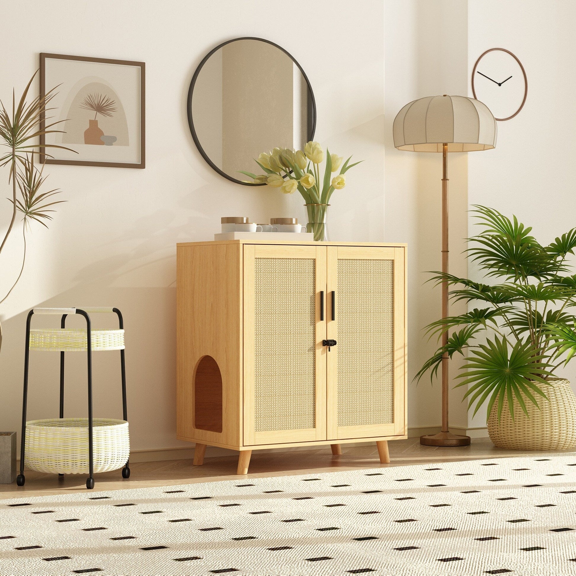【Maison pour chat multifonctionnelle 4 en 1】 Cette armoire en rotin à 2 portes est une maison polyvalente qui répond à divers besoins. Elle dissimule non seulement la litière de votre chat, mais offre également un espace privé et confortable à votre compagnon à quatre pattes. De plus, elle sert de meuble de rangement pour les friandises et les jouets de votre animal, ainsi que de table d'appoint pratique pour la salle de bain ou de table de chevet, s'intégrant parfaitement à votre décoration intérieure.