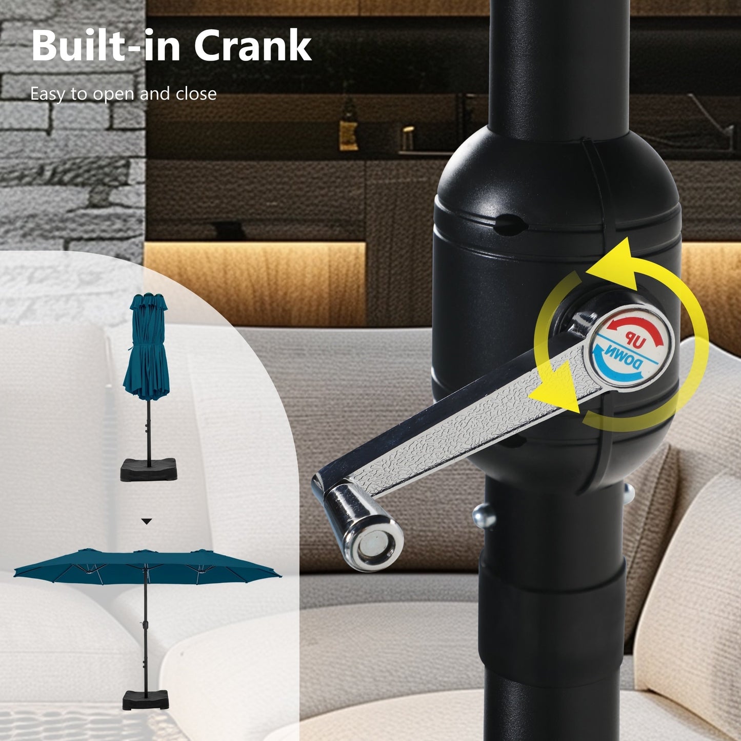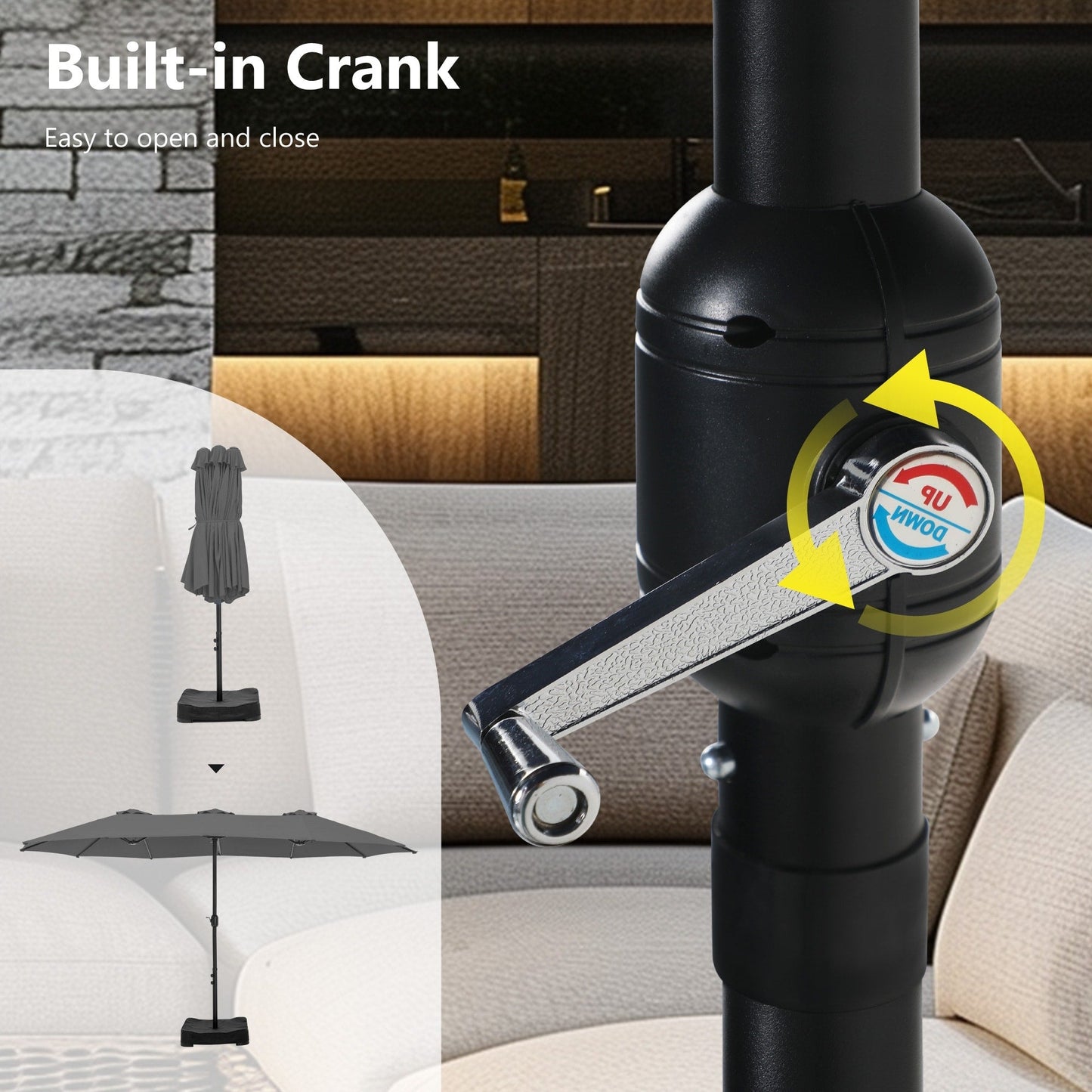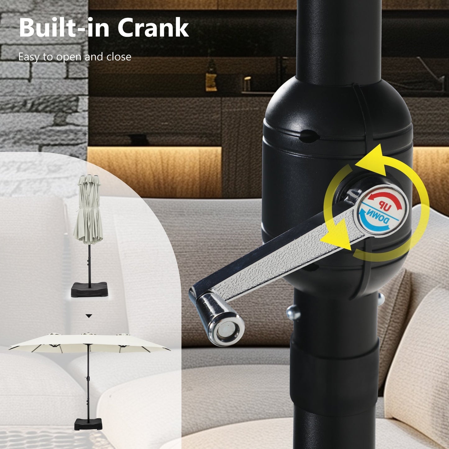 - Utilisation facile : La manivelle classique permet une installation facile en quelques minutes. Veuillez ouvrir le parasol une fois fixé à sa base.