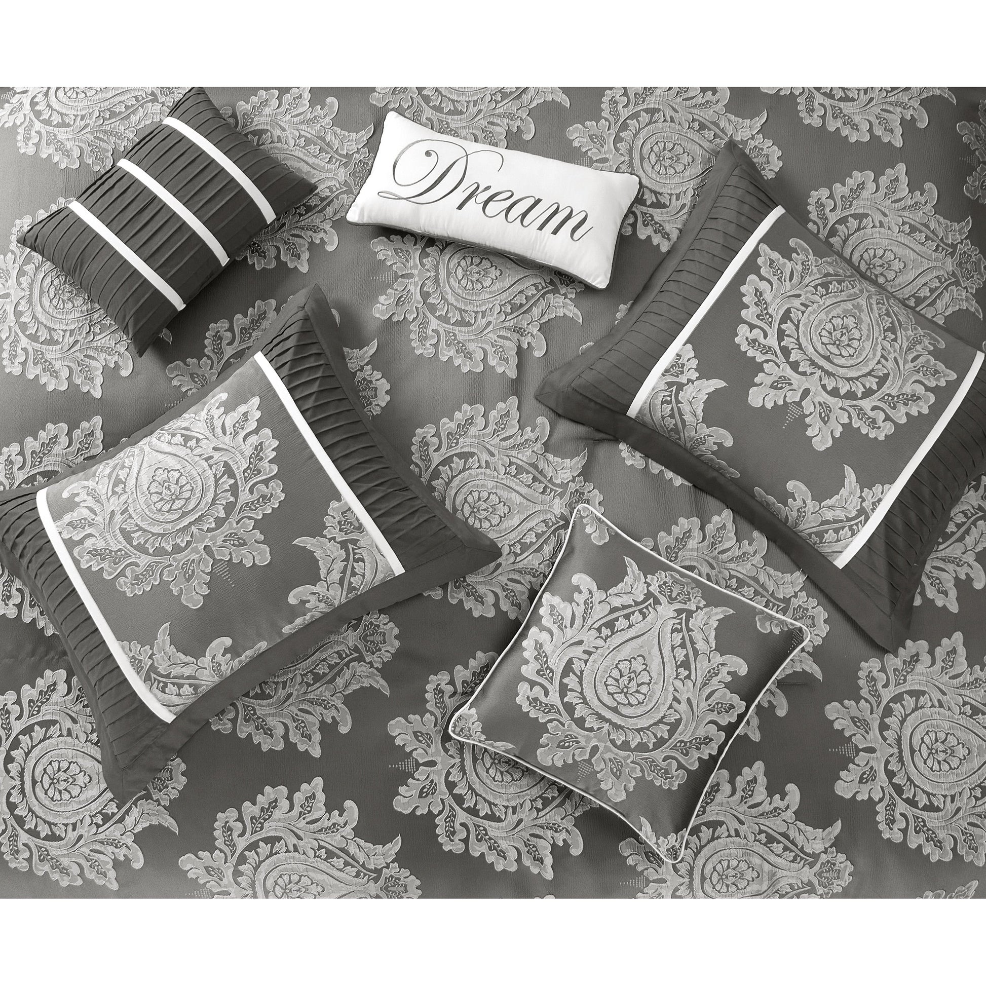 - L'ensemble comprend : (1) couette, (1) jupe de lit, (2) taies d'oreiller, (3) oreillers décoratifs