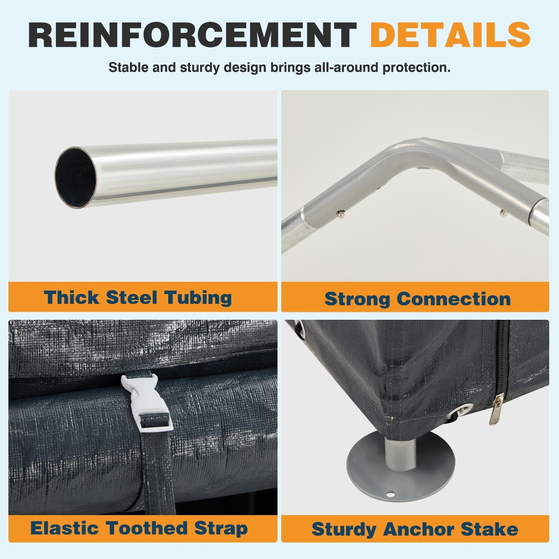 - Conception stable et durable : tube en acier épais, sangle élastique crantée, piquet d'ancrage robuste et connecteur à 4 voies pour une stabilité et une sécurité accrues. La porte à double fermeture éclair est pratique.