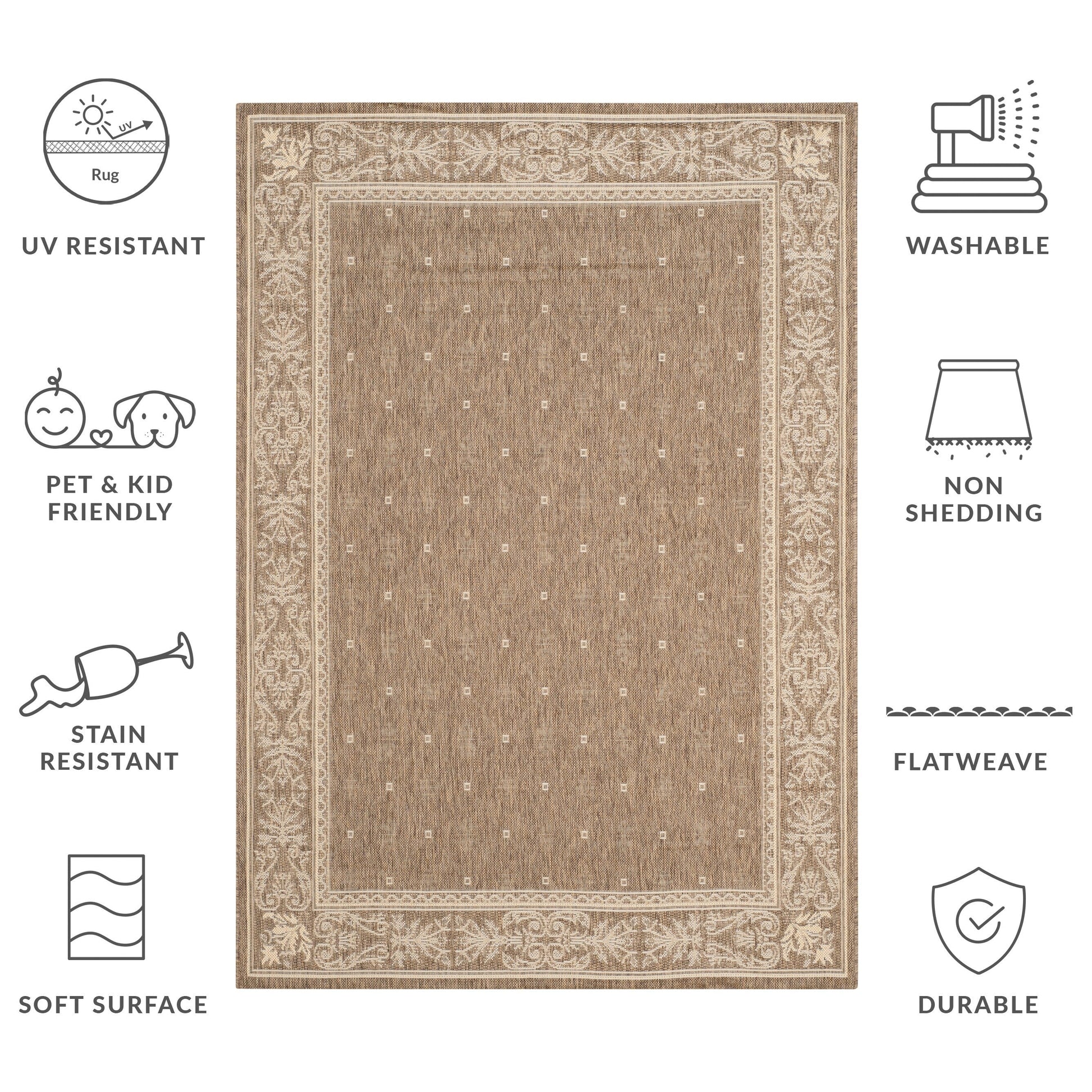 Idéal pour votre jardin, patio, terrasse, véranda ou bord de piscine, cet élégant tapis de la collection Courtyard est un ajout pratique à tout espace de vie extérieur ou intérieur. Adapté aux animaux et aux enfants, ce tapis facile d'entretien convient également aux zones à fort passage comme le vestiaire ou la cuisine. Cette magnifique collection de tapis révolutionne la décoration extérieure avec de nouveaux designs aux couleurs tendance et des motifs allant du classique au contemporain.