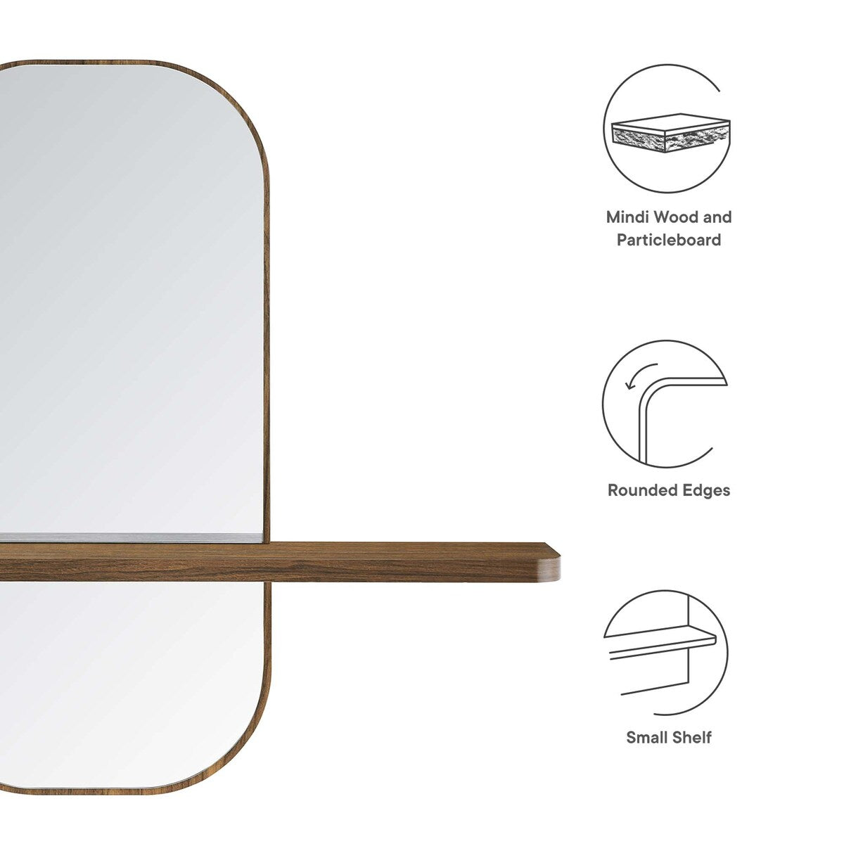 Le miroir Solstice apporte une touche de sophistication à tout espace. Savant mélange de styles contemporain et traditionnel, ce miroir rectangulaire aux bords arrondis et au design fendu en fait un élément décoratif idéal pour une entrée ou un vestiaire, mais aussi pour votre salon, votre chambre, votre salle de bain ou votre coiffeuse. Fabriqué en bois de mindi et en panneaux de particules avec un stratifié effet bois, ce miroir est conçu pour durer des années et apportera une touche d'élégance à tout intérieur. Une étagère supplémentaire est idéale pour ranger de petits objets tels que des clés, des produits d'hygiène et autres petits accessoires. Avec un assemblage minimal, ce miroir mural sera un atout esthétique pour tout intérieur.