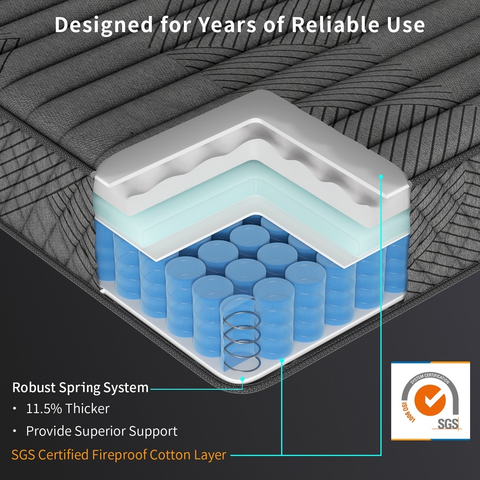 - Ressorts hélicoïdaux 11,5 % plus épais que la norme du marché : Offrent un meilleur soutien, une durée de vie plus longue et empêchent l'effondrement.