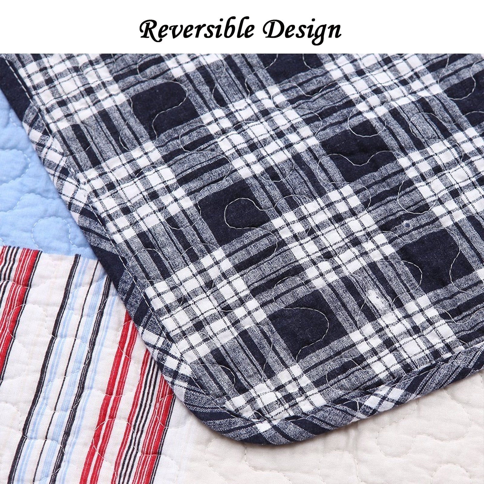 - Navy blue, red, white patchwork, reversible