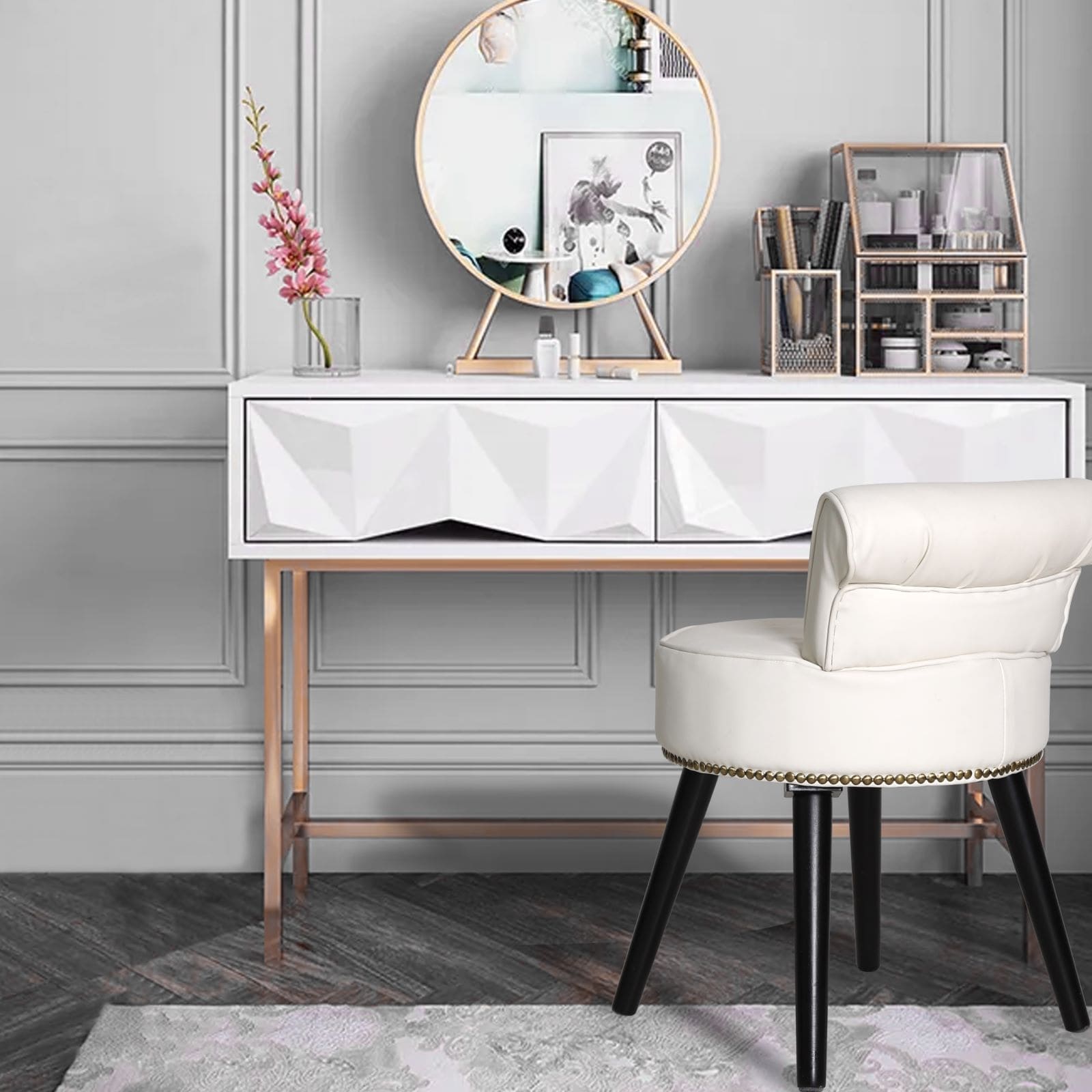 Enhance your morning routine with our VEIKOUS Makeup Vanity Stool Chair and add a touch of sophistication to your day. It is a versatile and stylish chair that can be used not only while applying makeup, but also provides the perfect space for writing, thinking or reading a book, exuding traditional charm. This stool features solid wood legs and a round seat that bends back for extreme comfort. The linen/velvet/leather interior, foam filled seats and light button tufting add to its classic appeal. Choose from a variety of colors to match your decor.