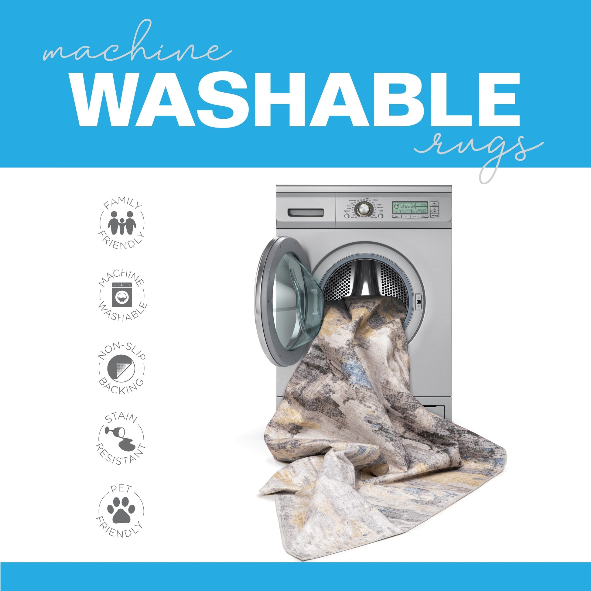 - Laver séparément en machine à l'eau froide avec une lessive douce sans javel, motif vers l'extérieur. Sécher à basse température ou suspendre pour sécher. Ne pas utiliser d'adoucissant. Ne pas utiliser d'aspirateur puissant avec brosse. Les tailles de 60 cm x 90 cm à 150 cm x 210 cm peuvent être lavées dans une machine à laver standard de 2,2 pi³ ou plus. La taille de 2,30 m x 3 m doit être lavée dans une machine à laver de 1,15 m³ uniquement.